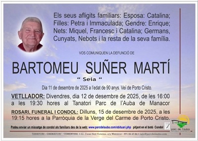 Ha fallecido en Porto Cristo Bartomeu Suñer Martí “Seia” a la edad de 90 años. Nos dejó ayer día 11 de diciembre de 2025. Se le despide hoy viernes día 12 de diciembre en el Tanatorio Parc del Auba de Manacor de las 16:00 horas y hasta las 19:30 horas. El lunes día 15 de diciembre será su funeral en la iglesia del Carmen de Porto Cristo a las 19:45 horas. Mi más sincero pésame a su familia y amigos, en especial a su esposa Catalina, sus hijas Petra e Inmaculada, sus hermanos, nietos.